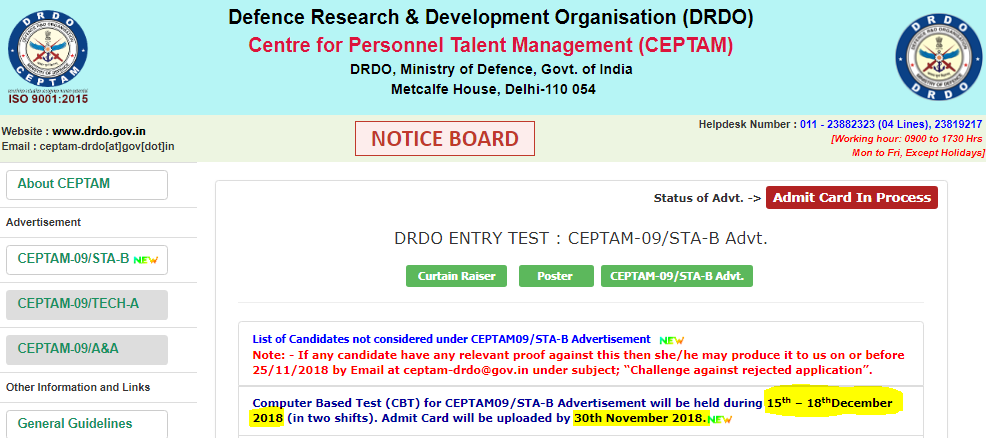 Drdo Ceptam Recruitment 2019 Ceptam 09 A A Exam Date Released Admit Card Releasing Soon